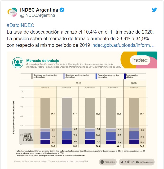 Por su parte, la sub ocupación no demandante, que refleja a quienes trabajan hasta 35 horas semanales y no buscan incrementar esa carga, se mantuvo casi sin cambios en 3,5%, apenas una décima por encima del 3,4% del período enero-marzo de 2019, y una décima menos que el 3,6% del último cuatrimestre del año pasado.