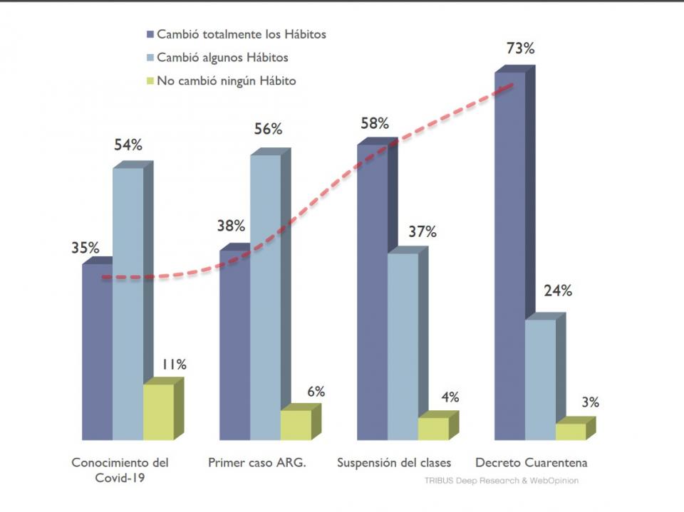 Cuando tomó conocimiento dela covid-19, ya un 35% decidió cambiar totalmente sus hábitos y un 54% modificó algunos de ellos. Cuando se conoció el primer caso de un argentino infectado con covid-19, el número subió a 38% de quienes cambiaron todos sus hábitos, y a un 56%, los que modificaron algunos de ellos. Para cuando el presidente, Alberto Fernández, decretó la cuarentena obligatoria, el 73% ya había cambiado totalmente sus hábitos y un 24% había modificado algunos de ellos.