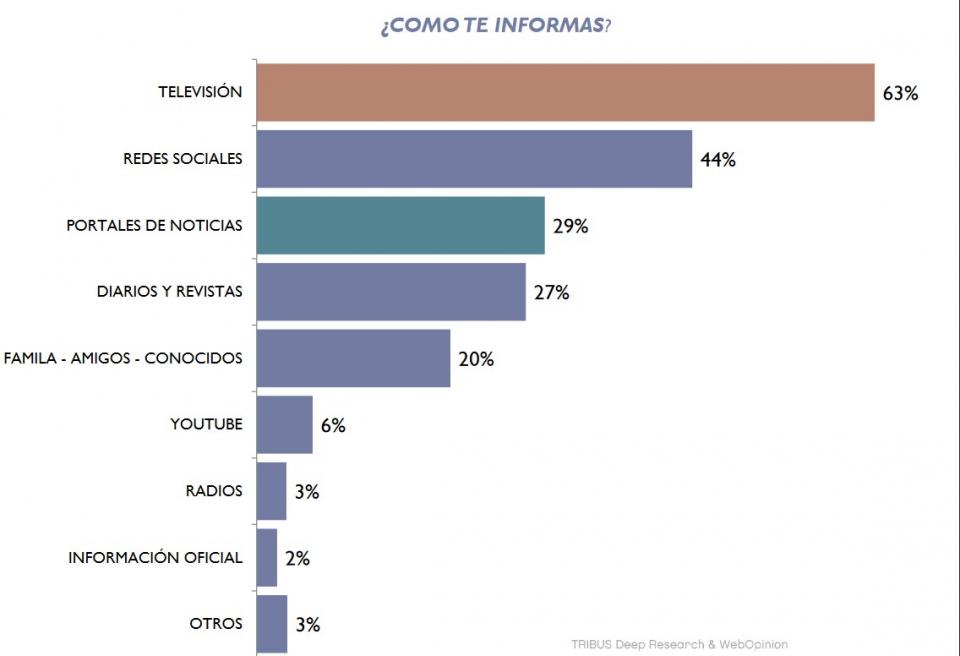 En relación a los medios con los que se informan, la televisión ocupa el primer lugar, en mayor medida por las mujeres. Esto fue respondido por el 63% por ciento de quienes participaron de la encuesta. A través de las redes sociales lo hizo el 44%; el 29% se informó mediante portales de noticias; el 27 por radios y revistas, el 6% mediante el canal YouTube y el 3% por radio. Sólo el 2% recurrió a información oficial. Quedaría para analizar por un profesional del campo de la psicología el hecho de que el 63% que se informe a través de la TV (que, muchos casos, con sus titulares catástrofe asusta a la población) y sólo el 2% recurra a la información oficial, si no radica en esas cifras el núcleo del pánico que muchos sienten por estos tiempos.