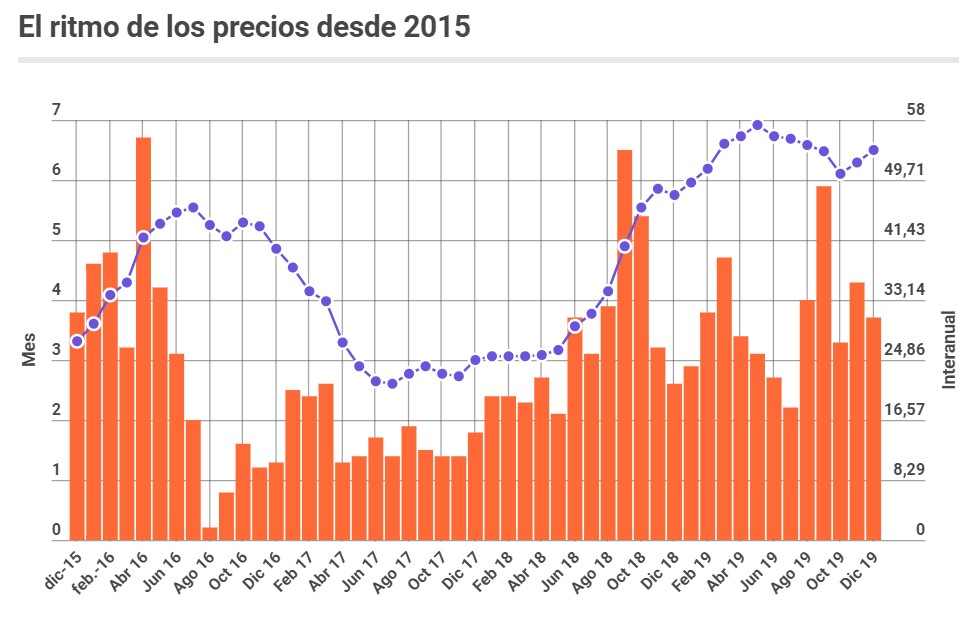 Tal como estaba previsto, el Indice de Precios al Consumidor (IPC) de diciembre se ubicó en 3,7%, lo que llevó a que el alza de precios en todo el 2019 trepara al 53,8%. El rubro que mostró mayor inflación fue el de alimentos y bebidas, muy sensible a la variación del dólar, que casi que se duplicó en un año, al pasar de $ 38 a $ 63 entre enero y diciembre.