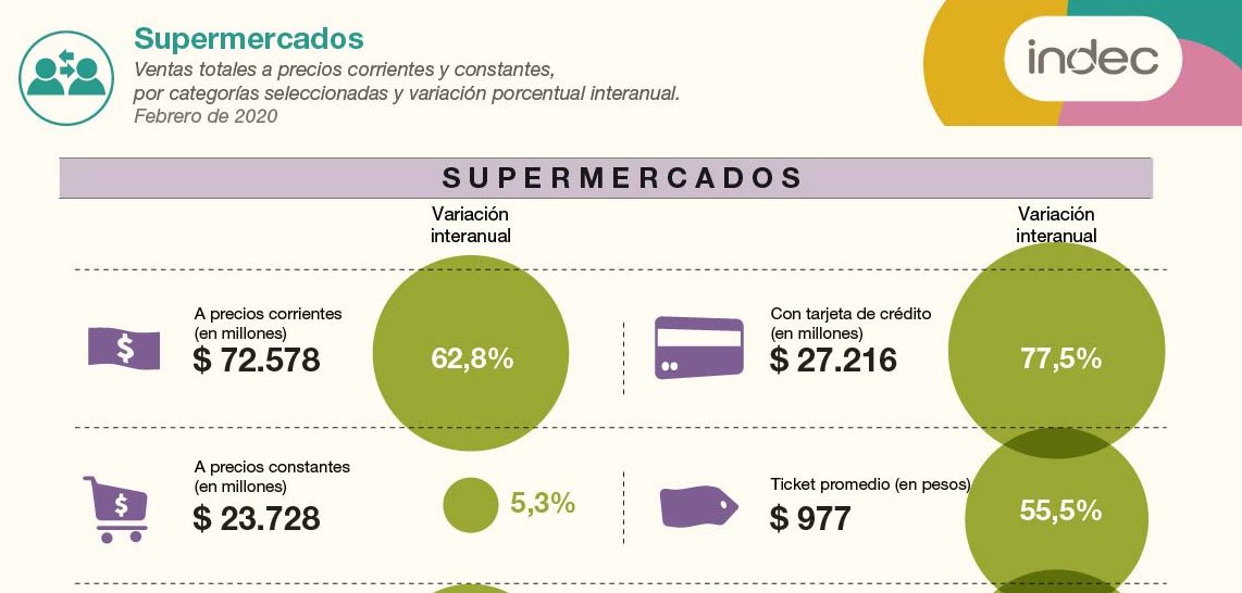 Las ventas en supermercados crecieron 5,3% interanual en febrero de 2020 y acumularon un alza de 1,7% en el 1° bimestre https://t.co/5ZzjGK9pxh pic.twitter.com/uk7RK3IpCx— INDEC Argentina (@INDECArgentina) April 23, 2020