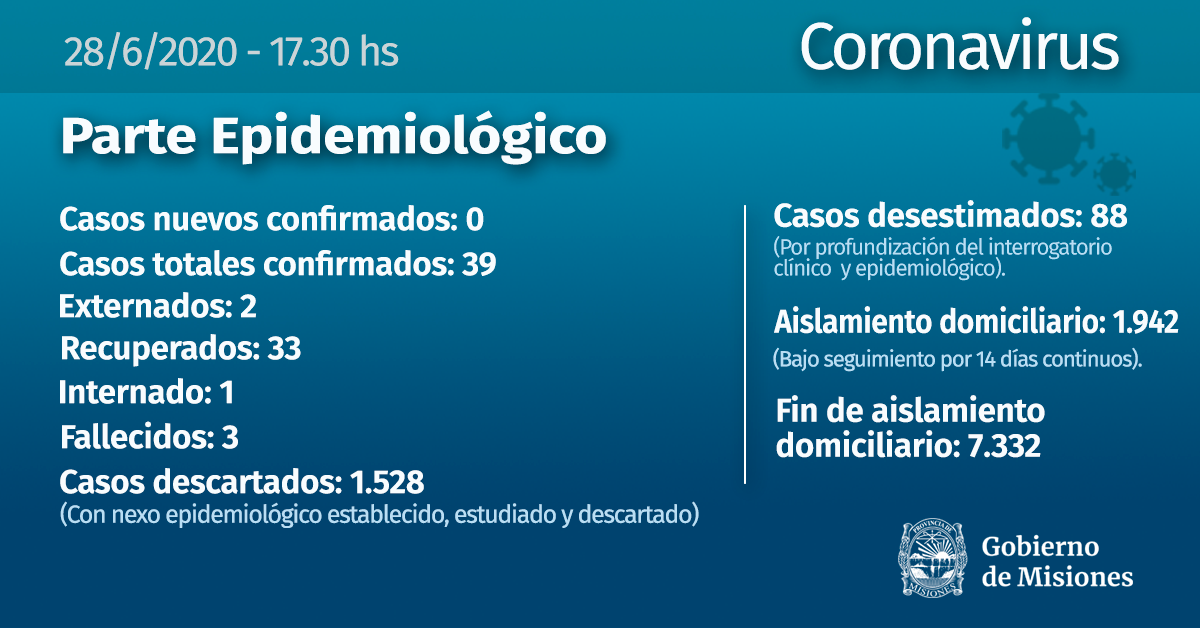 Según los datos del último parte epidemiológico emitido por el Ministerio de Salud de la Provincia de Misiones, no se registraron este domingo nuevos casos de Covid-19.