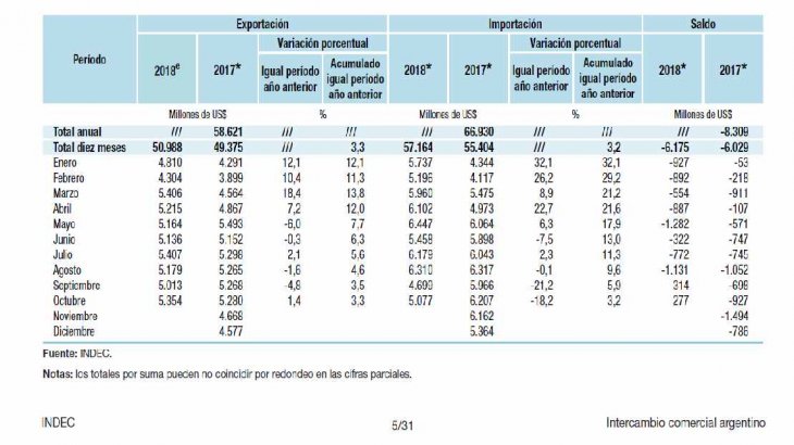 Según los datos del INDEC, el saldo total de la Balanza Comercial durante 2017 acusó un déficit de u$s 8.300 millones. El acumulado desde enero hasta octubre del 2018 marca un negativo de u$s 6.175 millones dado por un crecimiento del 3,3% en las exportaciones (u$s 50.988 millones contra u$s 49.375 millones en 2017) y del 3,2% en las importaciones (u$s 57.164 millones en 2018 contra u$s 55.404 millones en 2018).