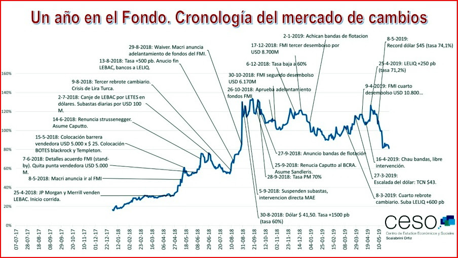 La desastrosa trayectoria de la economía argentina en el marco del acuerdo con el FMI, tiene como una de sus explicaciones, los desatinos en el manejo de la política cambiaria. En un año, el fondo pasó de sostener desestabilzadoras políticas de libre flotación con su elevado costo de devaluación e inflación, a permitir el uso de sus fondos para financiar la fuga de capitales en el marco del año electoral (una política reñida con su propia carta constitutiva). Mientras tanto, los resultados del acuerdo fueron violando gran parte de las metas prefijadas, dando lugar a sucesivos waivers que las fueron flexibilizando. Aún así, el organismo amplió los fondos otorgados a la actual administración, comprometiendo más del 61% de su cartera de crédito tradicional en Argentina (cerca del 40% cuando se incluyen otras líneas no convencionales).