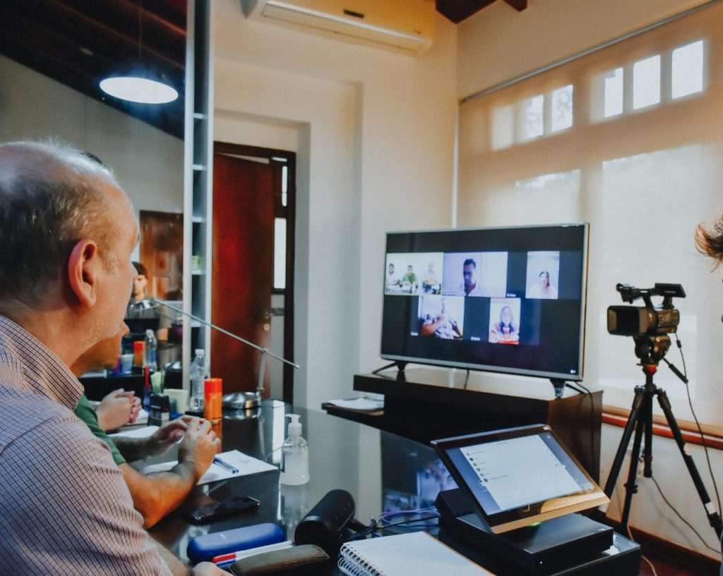 Posadas, 30 de marzo. Apelando a las nuevas tecnologías, el Gobernador no detuvo su agenda de trabajo y esta tarde mantuvo una reunión por videoconferencia con los jefes de bloques de la legislatura provincial. El uso de esta tecnología permitió respetar los protocolos de la emergencia sanitaria sin que eso repercuta en la agenda activa de trabajo que encara el mandatario provincial. En el encuentro participaron Martín Cesino, presidente del bloque Renovador, Liliana Rodríguez del Partido Libertad, Valores y Cambio; Javier Mela del bloque de la UCR; Jorge Ratier del PRO y Martín Sereno del Partido Agrario y Social.