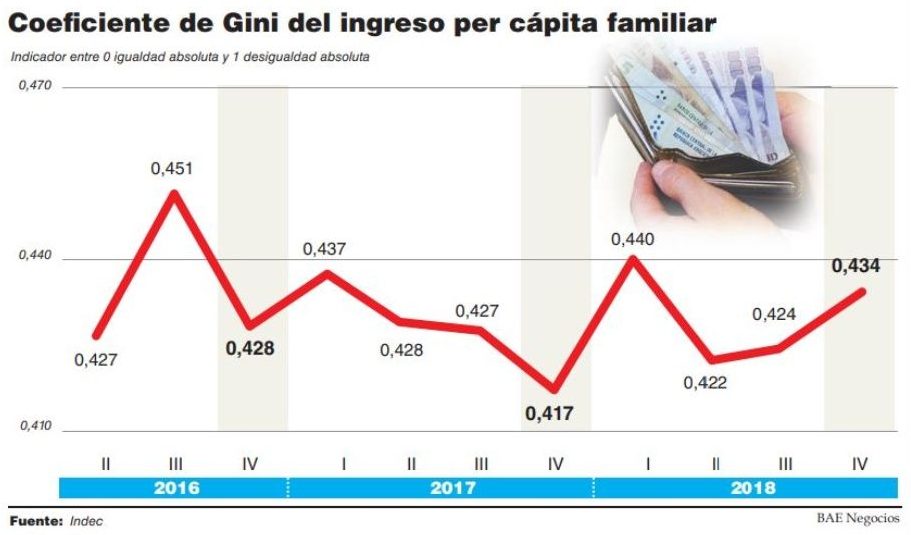 La escalada inflacionaria tras la devaluación y el consecuente derrumbe del poder adquisitivo de los salarios y las prestaciones sociales -que fue mayor en los sectores de más bajos ingresos-, sumadas a la destrucción de empleo, fueron el caldo de cultivo del deterioro en el reparto de la torta. Así, el coeficiente de Gini, que mide la inequidad distributiva, saltó del 0,417 en el 4° trimestre de 2017 al 0,434 en el mismo período de 2018, la mayor suba interanual de la serie que comienza en el 2° trimestre de 2016, después del apagón estadístico. Vale aclarar que en este indicador el valor 0 equivale a la igualdad absoluta y el 1 a la desigualdad absoluta.