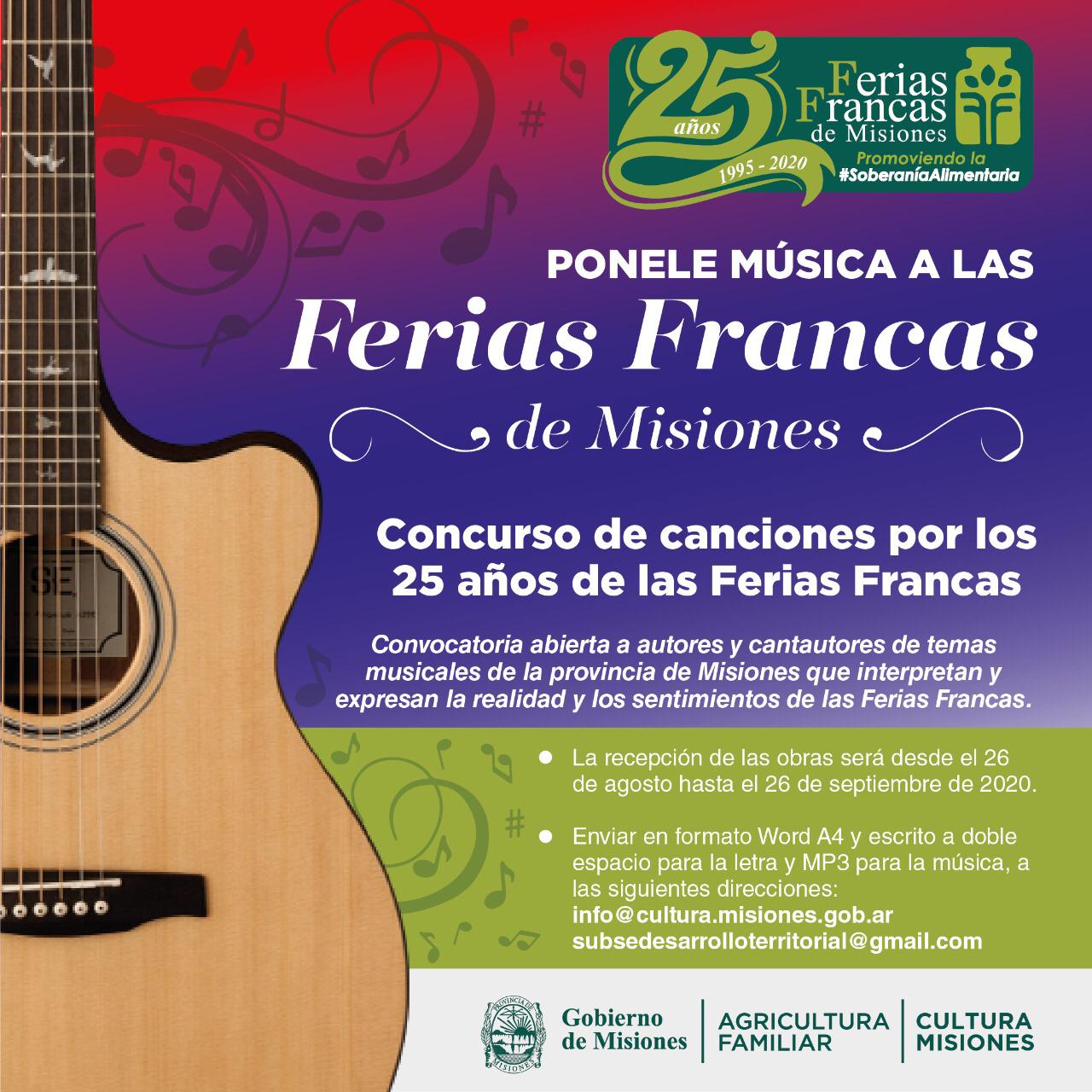 El concurso de canciones “25 años de las Ferias Francas”, organizado por la Subsecretaría de Desarrollo Territorial (dependiente de la Secretaría de Agricultura Familiar) y la Secretaría de Cultura de la Provincia, convoca a autores y cantautores de temas musicales que interpreten y expresen la realidad de las ferias francas, los feriantes y su contexto, plasmando su historia, sentimientos y tradiciones, y apunta a afianzar la identidad y el sello de la agricultura familiar misionera a través de la creación significativa de letras y melodías.