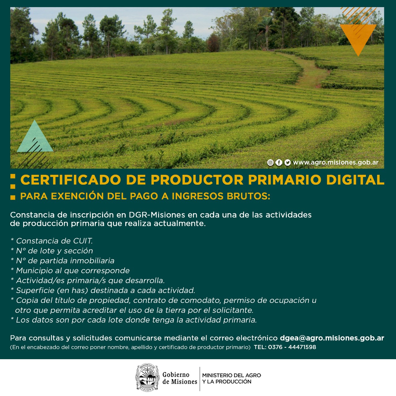 Cabe destacar que el trámite es personal y gratuito. En el marco de las acciones de prevención por Covid-19 y con el fin de seguir atendiendo a las necesidades de los productores, se solicita la presentación y envío de la documentación en formato digital al siguiente correo dgea@agro.misiones.gob.ar. Notificar en el asunto del correo “apellido y nombre del solicitante + certificado de productor primario” (Ejemplo: DA SILVA HORACIO - Certificado de Productor Primario).