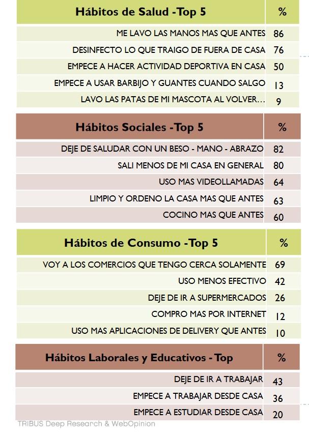 ¿Qué hace la gente en cuarentena? fue la pregunta disparadora. Los resultados arrojaron los siguientes resultados: ordenar y limpiar el hogar (25%); rutinas de desinfección al ingresar al hogar (21%); cocina más (19%); educación y trabajo on line (16%); gimnasia en el hogar (15%); medita/reza/yoga/descansa más (12%); juego y actividades familiares (11%); lectura/escritura/arte/hobbies (11%); series/games/redes sociales/YouTube (10%); jardinería y huertas (3%).