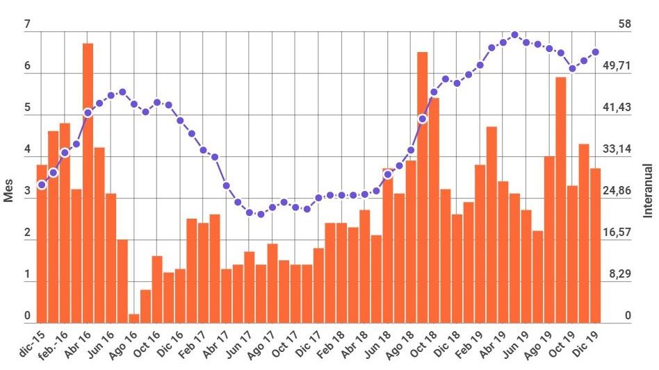Tal como estaba previsto, el Indice de Precios al Consumidor (IPC) de diciembre se ubicó en 3,7%, lo que llevó a que el alza de precios en todo el 2019 trepara al 53,8%. El rubro que mostró mayor inflación fue el de alimentos y bebidas, muy sensible a la variación del dólar, que casi que se duplicó en un año, al pasar de $ 38 a $ 63 entre enero y diciembre.