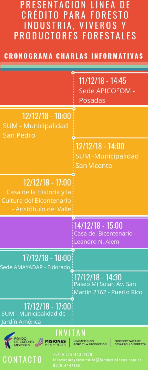 La subsecretaría de Desarrollo Forestal del Ministerio del Agro y la Producción comunica el Cronograma de charlas informativas donde se realizará la presentación de Línea de Crédito para Foresto Industria, Viveros y Productores Forestales con el fin de informar a los interesados.