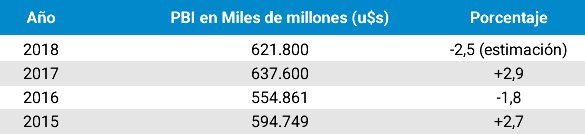 De este modo, el 2018 significa un brusco cambio con respecto al 2017, año en que el PBI creció un 2,9% (la mayor desde 2011) según los datos difundidos por el INDEC una suba que estuvo impulsada por el crecimiento en los niveles de inversión, el sector agropecuario y un leve aumento en el consumo.